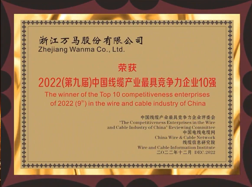 ▲萬馬股份“2022年度中國線纜行業最具競爭力企業10強”獎牌