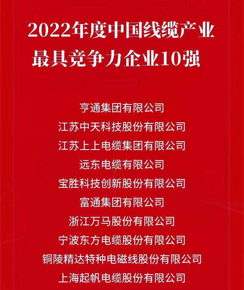 ▲ “2022年度中國線纜行業最具競爭力企業10強”榜單