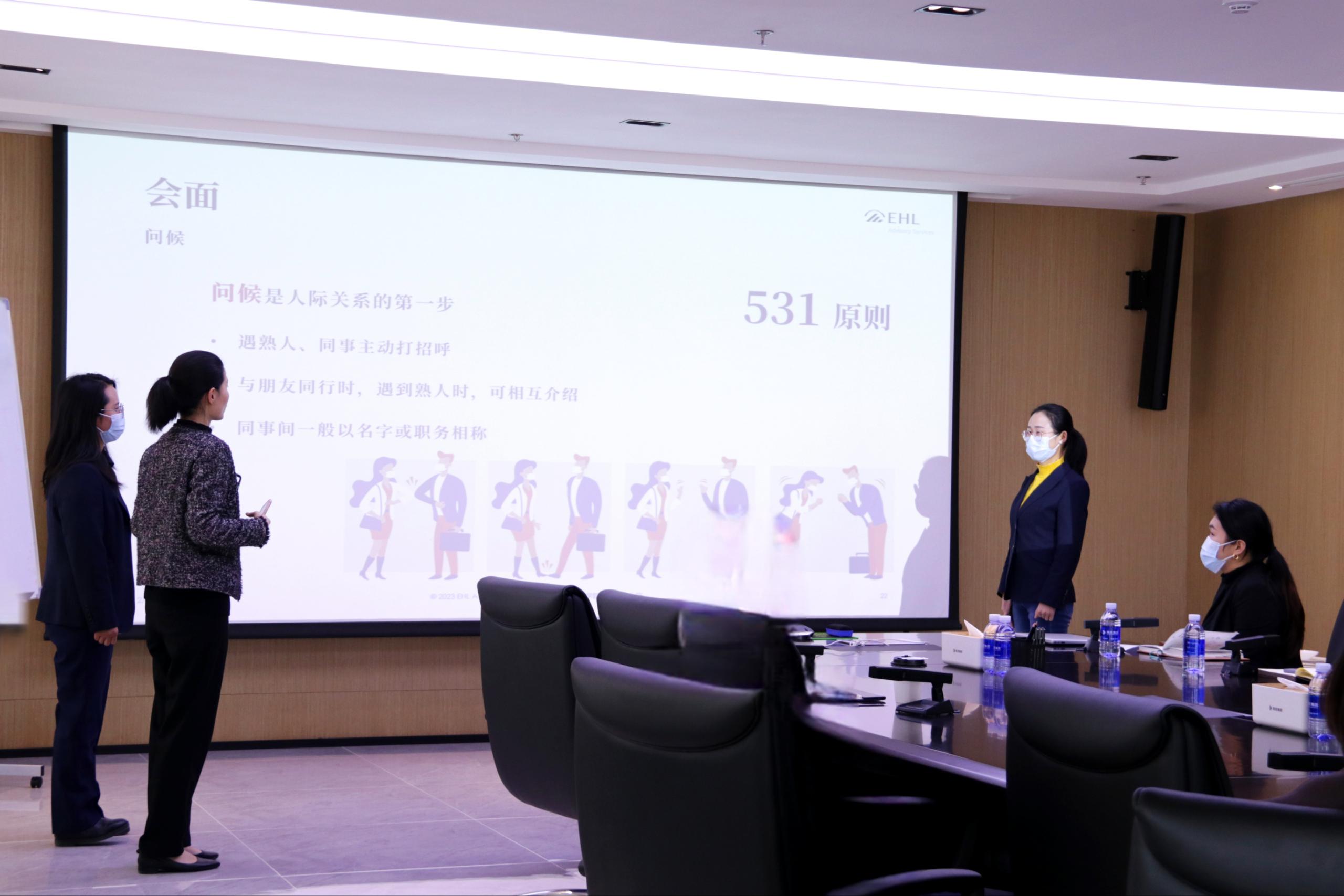 此次培訓(xùn)邀請(qǐng)了洛桑酒店管理學(xué)院集團(tuán)咨詢公司顧問呂堃講師、助理顧問謝一晗講師針對(duì)商務(wù)禮儀進(jìn)行授課。在培訓(xùn)中,兩位培訓(xùn)講師采取理論教學(xué)和現(xiàn)場(chǎng)互動(dòng)實(shí)踐相結(jié)合的方式。一方面,通過援引事例生動(dòng)闡釋商務(wù)禮儀的概念、作用、行為標(biāo)準(zhǔn)等理論知識(shí);另一方面,通過場(chǎng)景模擬實(shí)踐、特定情境互動(dòng)表演等環(huán)節(jié)詳細(xì)示范和訓(xùn)練禮儀規(guī)范。參訓(xùn)人員即學(xué)即練,在現(xiàn)場(chǎng)實(shí)踐互動(dòng)中加深了對(duì)商務(wù)禮儀的理解和把握。