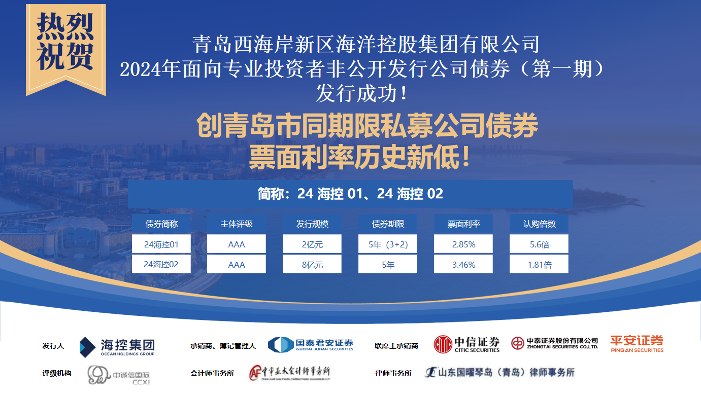 3月4日,海控集團成功發行2024年面向專業投資者非公開發行公司債券(第一期),票面利率創青島市同期限私募公司債券歷史新低。